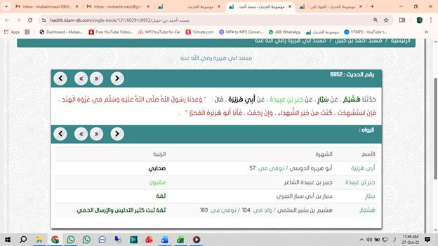 اس کے بعد آپ اسی ویب سائٹ کو کلک کر کے سرچ کر لیجیے کہ خاص کیورڈ ’’غزوۃ الھند‘‘ کو سرچ کر لیں گے تو ہندوستان سے متعلق جنگ والی تمام احادیث اکٹھی آ جائیں گی۔ یہ ویب سائٹ حدیث کی تمام کتابوں کا موسوعہ یعنی لائبریری ہے۔