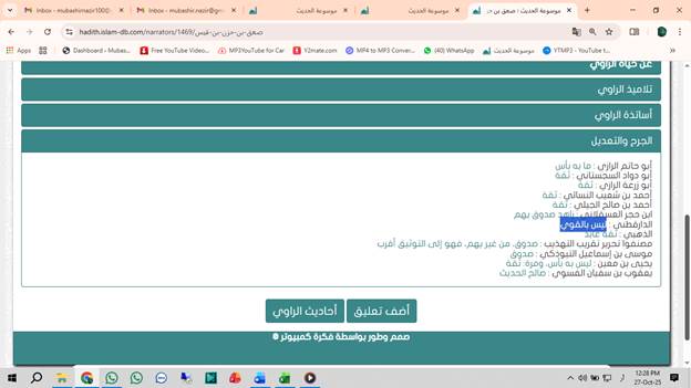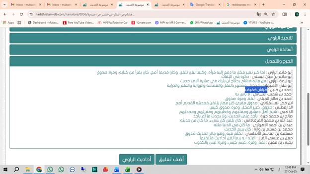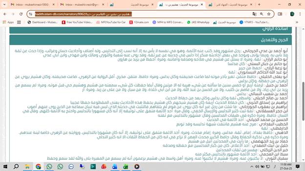 ہر روایت میں ’’ھشیم بن بشیر‘‘ کے نام کو دیکھیے کہ وہ حضرت ابوہریرہ رضی اللہ عنہ کے نام پر جعلی حدیث پھیلاتا رہا تھا اور ریسرچرز نے چیک کر لیا کہ وہ وہ ھشیم ’’تدلیس‘‘ کا ماہر تھا۔ لفظ تدلیس کا معنی ہے کہ وہ شخص جو جعلی کہانیاں ایجاد کرتا ہے۔ آپ اس نام پر کلک کیجیے اور عربی میں ان کی شخصیت کو دیکھ لیجیے۔ اس میں ان صاحب ھشیم کی سیرت سامنے آتی ہے کہ یہ صاحب کس زمانے کے ہیں اور کس شہر میں رہے ہیں اور ان کا کیرئیر کیسا گزرا ہے۔ اس میں آپ بالخصوص ’’الجرح و التعدیل‘‘ کو کلک کیجیے تو تمام ریسرچرز کا رزلٹ سامنے آ جاتا ہے۔ اسی میں کیورڈ ہے ’’یدلس‘‘ یعنی جعلی احادیث ایجاد کرتے تھے۔