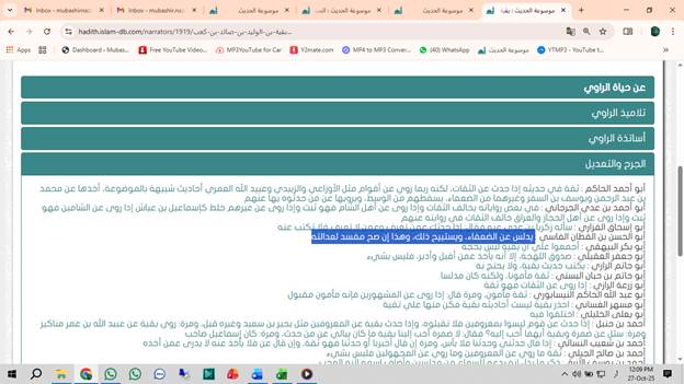 اب آپ ان کے نام بقیہ بن الولید پر کلک کیجیے اور دیکھی تو ان کی سیرت پر ریسرچرز نے دیکھا ہے کہ وہ ’’یدلس‘‘ یعنی جعلی حدیث بیان کرتے تھے اور عدالت میں انہیں فسادی قرار دیا تھا۔