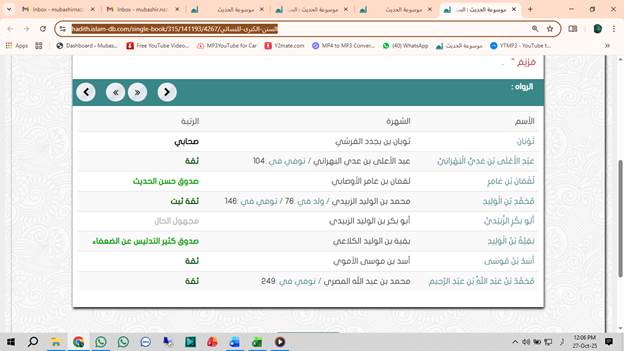 أنبأ مُحَمَّدُ بْنُ عَبْدِ اللَّهِ بْنِ عَبْدِ الرَّحِيمِ ، قَالَ : حدثَنَا أَسَدُ بْنُ مُوسَى ، قَالَ : حدثَنَا بَقِيَّةُ بْنُ الْوَلِيدِ ، قَالَ : حَدَّثَنِي أَبُو بَكْرٍ الزُّبَيْدِيُّ ، عَنْ أَخِيهِ مُحَمَّدِ بْنِ الْوَلِيدِ ، عَنْ لُقْمَانَ بْنِ عَامِرٍ ، عَنْ عَبْدِ الأَعْلَى بْنِ عَدِيٍّ الْبَهْرَانِيِّ ، عَنْ ثَوْبَانَ مَوْلَى رَسُولِ اللَّهِ صَلَّى اللَّهُ عَلَيْهِ وَسَلَّمَ ، قَالَ : قَالَ رَسُولُ اللَّهِ صَلَّى اللَّهُ عَلَيْهِ وَسَلَّمَ : " عِصَابَتَانِ مِنْ أُمَّتِي عِصَابَةٌ تَغْزُو الْهِنْدَ ، وَعِصَابَةٌ تَكُونُ مَعَ عِيسَى ابْنِ مَرْيَمَ "۔ سنن النسائي، 3: 28، رقم: 4267، دار الکتب العلمیة بیروت